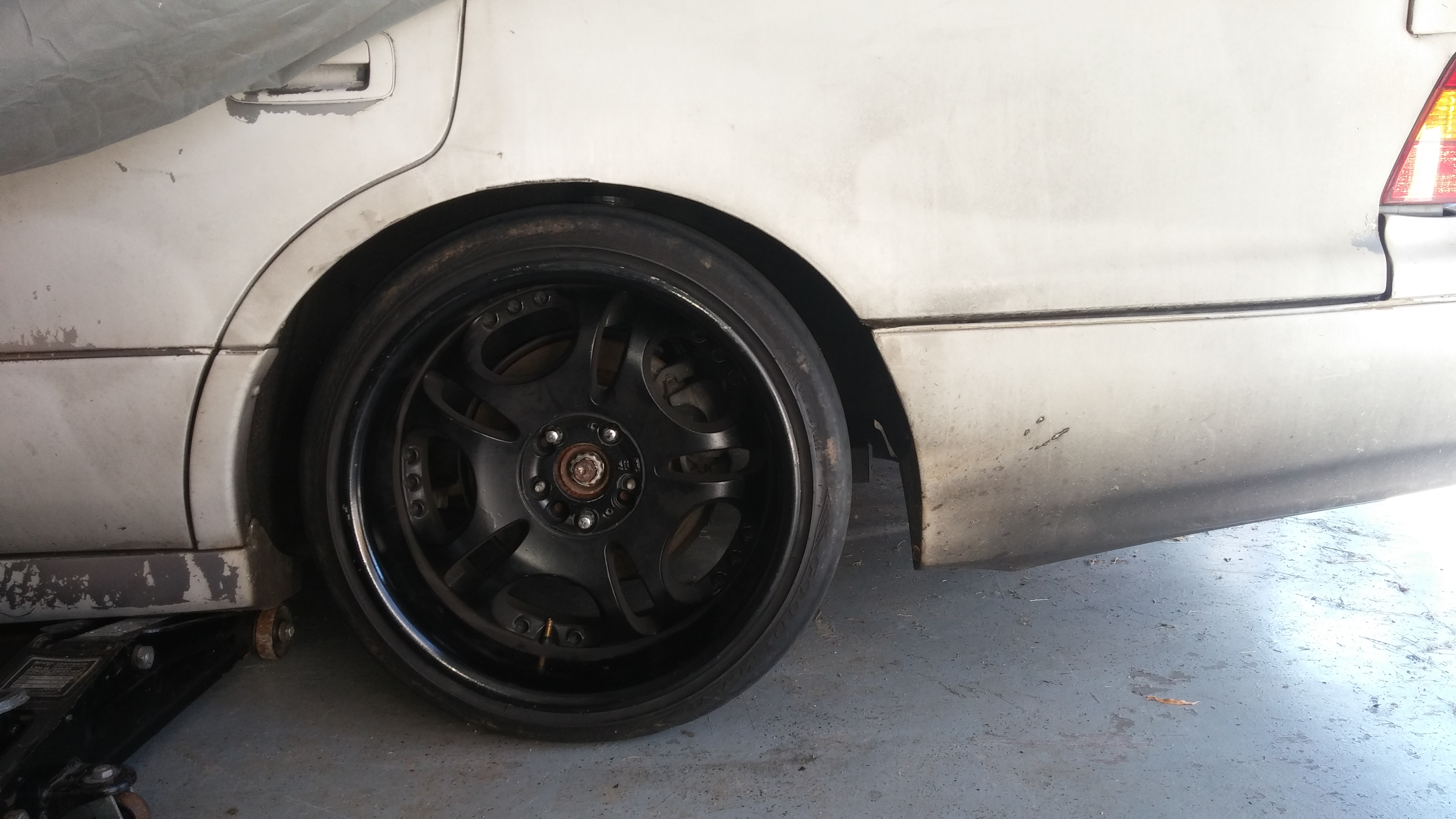 Lowenhart LD-1 18×10 -9 square. Test fit the rear and it pokes. Need more low and wider tire and some negative camber should look good.